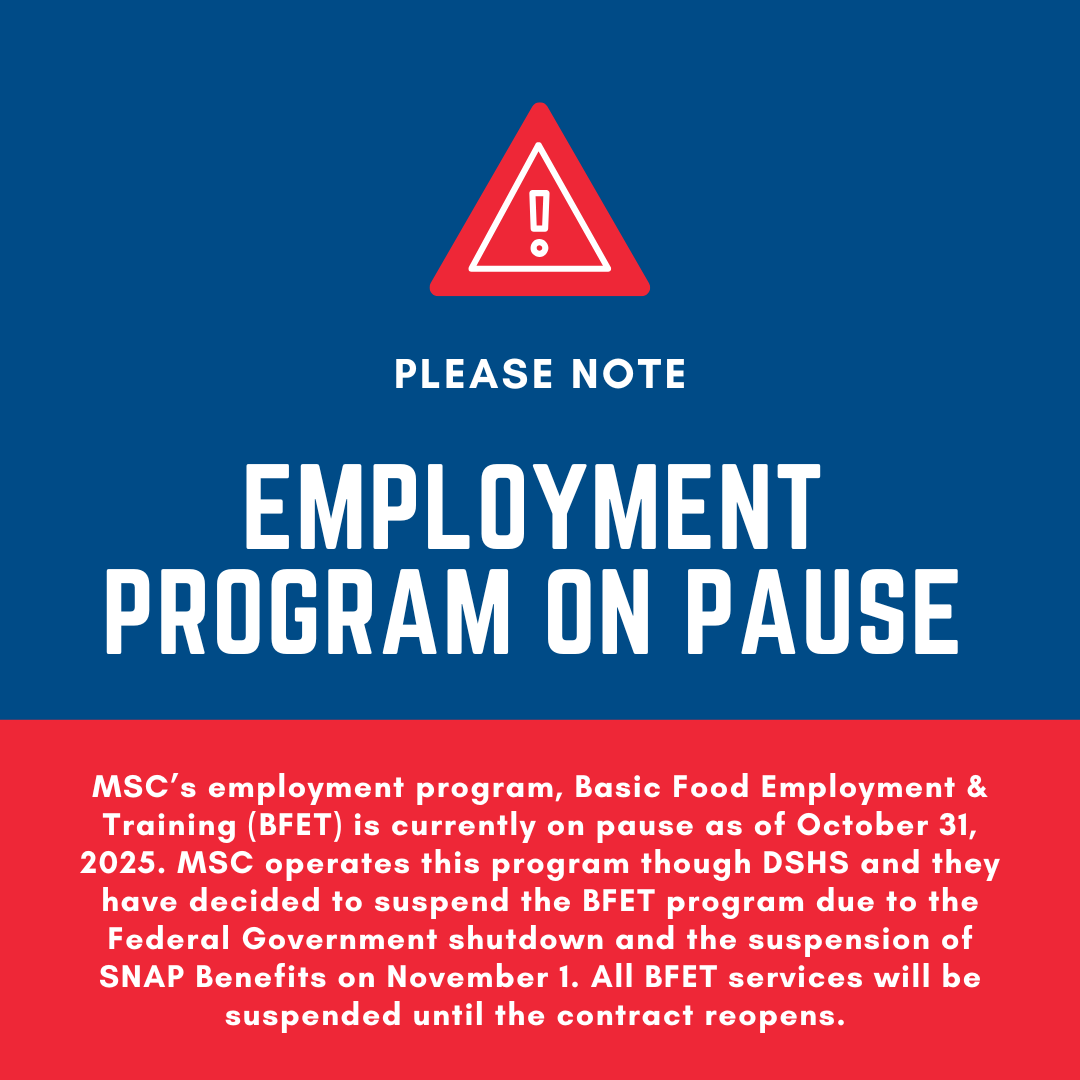 MSC’s employment program, Basic Food Employment & Training (BFET) is currently on pause as of October 31, 2025. MSC operates this program though DSHS and they have decided to suspend the BFET program due to the Federal Government shutdown and the suspension of SNAP Benefits on November 1. All BFET services will be suspended until the contract reopens.